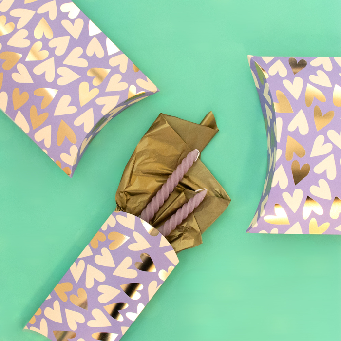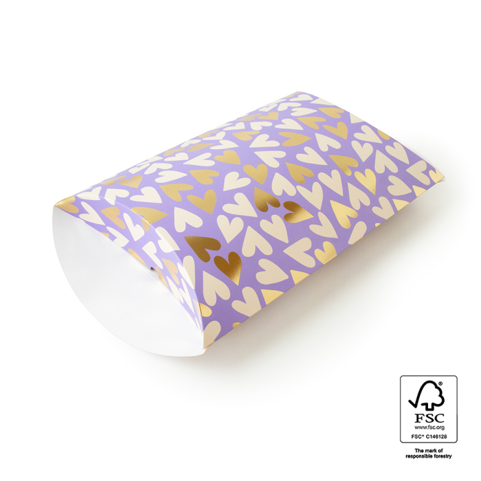 Uit de collectie van House of Products hebben we deze grote (40cm x 28cm) en supergave gondeldozen in ons assortiment opgenomen! Groot genoeg om een paar babyschoentjes, een flesje parfum of een grote zak snoep in te verpakken. Deze opvallende doosjes combineren crèmekleurige en prachtige gouden glanzende grote harten op een lila achtergrond.